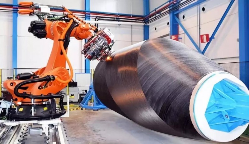 在工艺的第三个阶段,搬运机器人将机身结构运至下一个作业平台,并将其尾固定住。然后,MTorres铺丝机开始在结构表面铺设碳丝,并终形成飞机的外蒙皮。层碳丝按碳环表面凹槽的形状铺设完毕之后,在凹槽内加入一种填料。这种填料可能是泡沫芯材,作为绝缘材料加以利用;也可以是一种可溶解的材料,能够在外蒙皮完成固化后取出。
