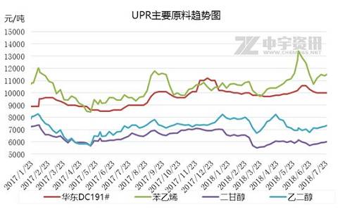 据中宇资讯监测数据,截止7月中旬,华东苯乙烯由前期的10650元/吨反弹到11600元/吨,上涨近千元/吨,二乙二醇由5600元/吨反弹至6080元/吨,涨幅在480元/吨,乙二醇由6800元反弹至7400元/吨,涨幅在600元/吨,主流原料的上涨令市场看空气氛逐步消散,但树脂方面总体企稳为主,价格方面显然已无再降空间,行业淡季难摆脱出货压力,多争取价稳走量。
