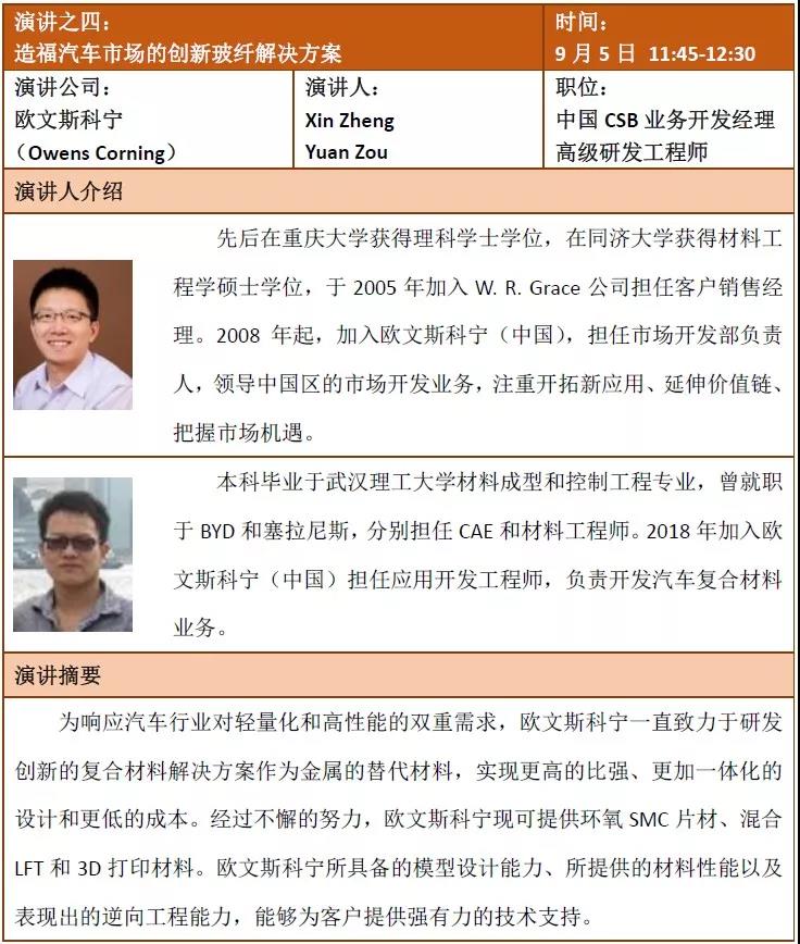 目前,活动已经邀请到奥迪、雷诺等一流主机厂;佛吉亚、福伊特、孚利模、LG Hausys等一级汽车零部件供应商;杜邦、阿科玛、瀚森化工、欧文斯科宁等先进材料供应商;德国弗劳恩霍夫研究所等顶级科研院所参与。他们将通过产品展示、会议研讨等方式,让国际复材展的观众亲身体验汽车复合材料应用的发展现状和未来趋势。