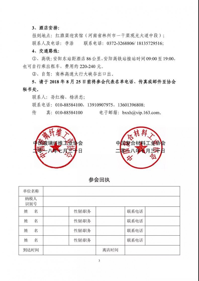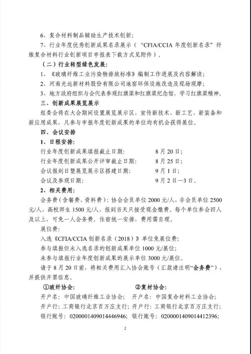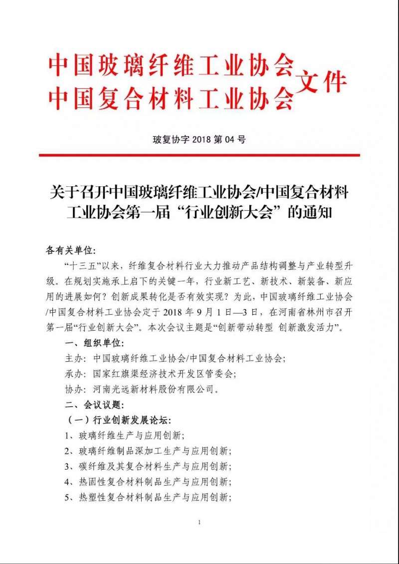 为推动和鼓励行业新工艺、新技术、新装备、新应用的研发与应用,实现创新成果转化,玻璃纤维工业协会/复合材料工业协会定于2018年9月1日~3日,在河南省林州市召开届“行业创新大会”。目前,会议正在紧张筹备当中,报名系统已经开启,欢迎业内同仁踊跃报名。