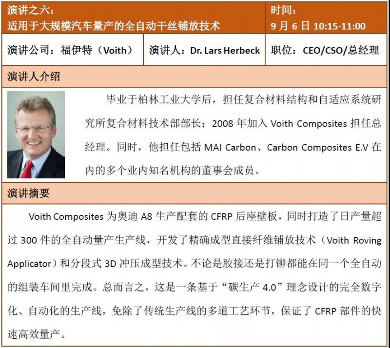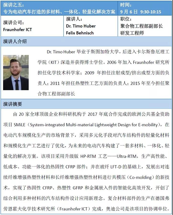 目前,活动已经邀请到奥迪、雷诺等一流主机厂;佛吉亚、福伊特、孚利模、LG Hausys等一级汽车零部件供应商;杜邦、阿科玛、瀚森化工、欧文斯科宁等先进材料供应商;德国弗劳恩霍夫研究所等顶级科研院所参与。他们将通过产品展示、会议研讨等方式,让国际复材展的观众亲身体验汽车复合材料应用的发展现状和未来趋势。
