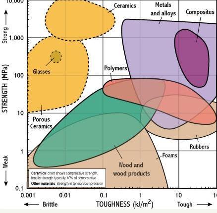 对于工程中使用的碳纤维来说,纤维的排布既可以是单一方向的,也可以是多方向交叉叠加的。其中常用的当然是多方向交叉的,这也就是我们常见的那种碳纤维的外观。纤维的性能就是单纯的测量单一的圆柱体,这样测试出来的性能非常惊人,也就是很多人甚至有些科普读物里常说的数倍甚至十倍于钢材。但是真正工程应用中使用的并不是单一的一根一根的纤维,而是纤维和树脂共同组成的「纤维复合材料」,其工程性能不仅仅取决于单根纤维的性能,还受树脂性能和纤维密度的影响,更受纤维方向的影响。也就是说,终碳纤维材料的性能,其实是纤维性能和填充树脂性能的加权平均。对于大多数碳纤维复合材料来说,测试的结果虽然可能强于钢材,但差别并没有达到天差地别的程度。我们可以比较一下一般的碳纤维和一般的钢材。比如说,我们可以看一下强度和断裂能量的对比。简单说,我们用不同材料做成相同大小的筷子一样的圆柱体。所谓强度就是拉断这根筷子所需要的力,而所谓断裂能量就是用一个大铁锤砸断这根筷子所需要的能量,一定程度上体现的就是材料的抗冲击能力。