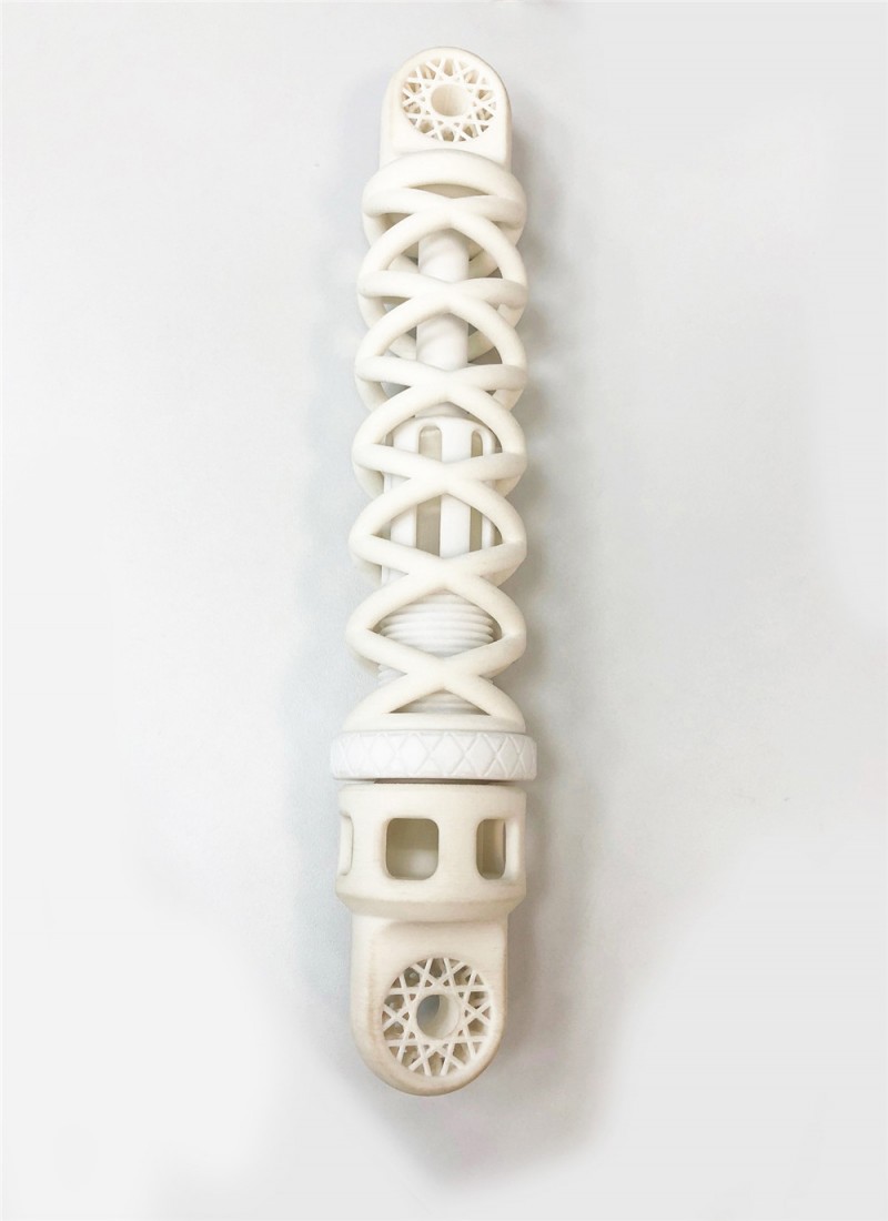 除了高度的功能性之外,减震器的独特之处还在于通过三种不同的制造工艺生产各个部件,并运用三种不同的制造工艺。 40 x 7厘米部件的外部弹簧是由粉末状热塑性聚氨酯(TPU)制成,运用选择性激光烧结逐层成形,并且具有良好的弹性和高耐磨性。
