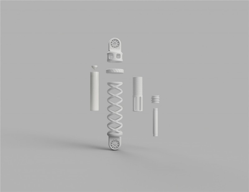 减震器内部的调节螺钉必须非常坚固。因此,它由科思创坚固的聚碳酸酯材料中的长丝材料,采用熔丝制造(FFF)工艺制成。内部的空气室由液态聚氨酯树脂制成。数字光处理方法已经被证明适用于这种具有丝状结构的元件,在这里也同样适用。