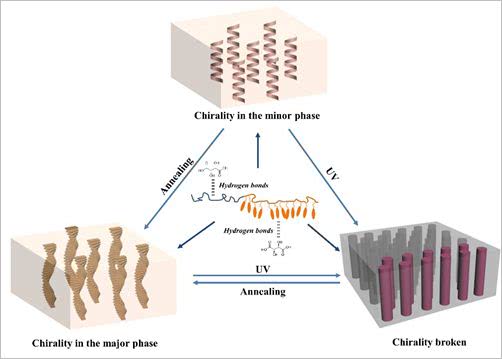 图2.手性传导诱的导螺旋纳米结构、聚集手性在聚合物多相结构间的传递以及光调控的示意图