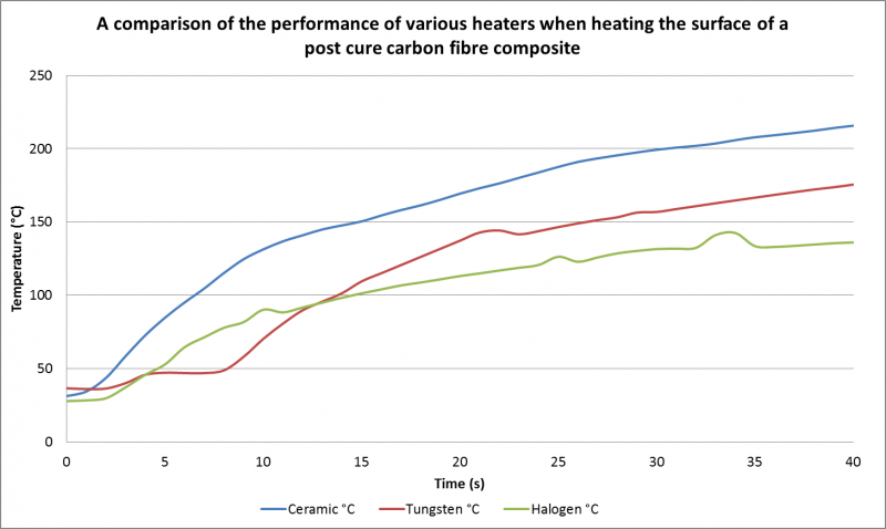 A comparison of the performance of various heaters when heating the surface of a post cure carbon fibre composite