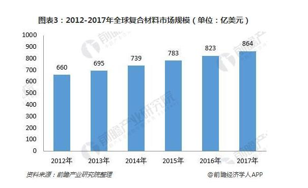 在亚太地区复合材料需求刺激下,加快了复合材料产能规划,复合材料的生产能力不断提高,从推动了行业产量的不断增长。2017年复合材料产值约为867亿美元,同比去年增长5.73%。
