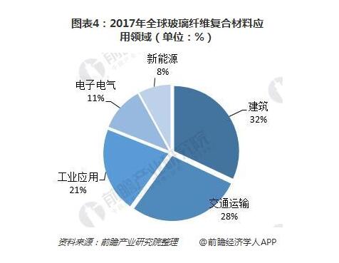 在玻纤消费市场中,玻纤的主要应用领域集中在建筑、交通运输、工业应用、电子电气、新能源等领域,占比分别达32%、28%、21%、11%和8%。