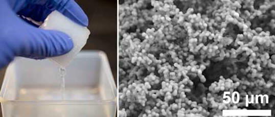 图为棉花糖状凝胶的宏观图和扫描电子显微镜下的微观图
