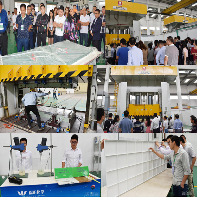 下午14时许,主办方邀请与会人员参观百汇达模压车间并进行现场演示。包括:模压生产演示,自动化真空导入演示,低VOC演示,石材粘底网平面演示,低VOC排放树脂制品等。