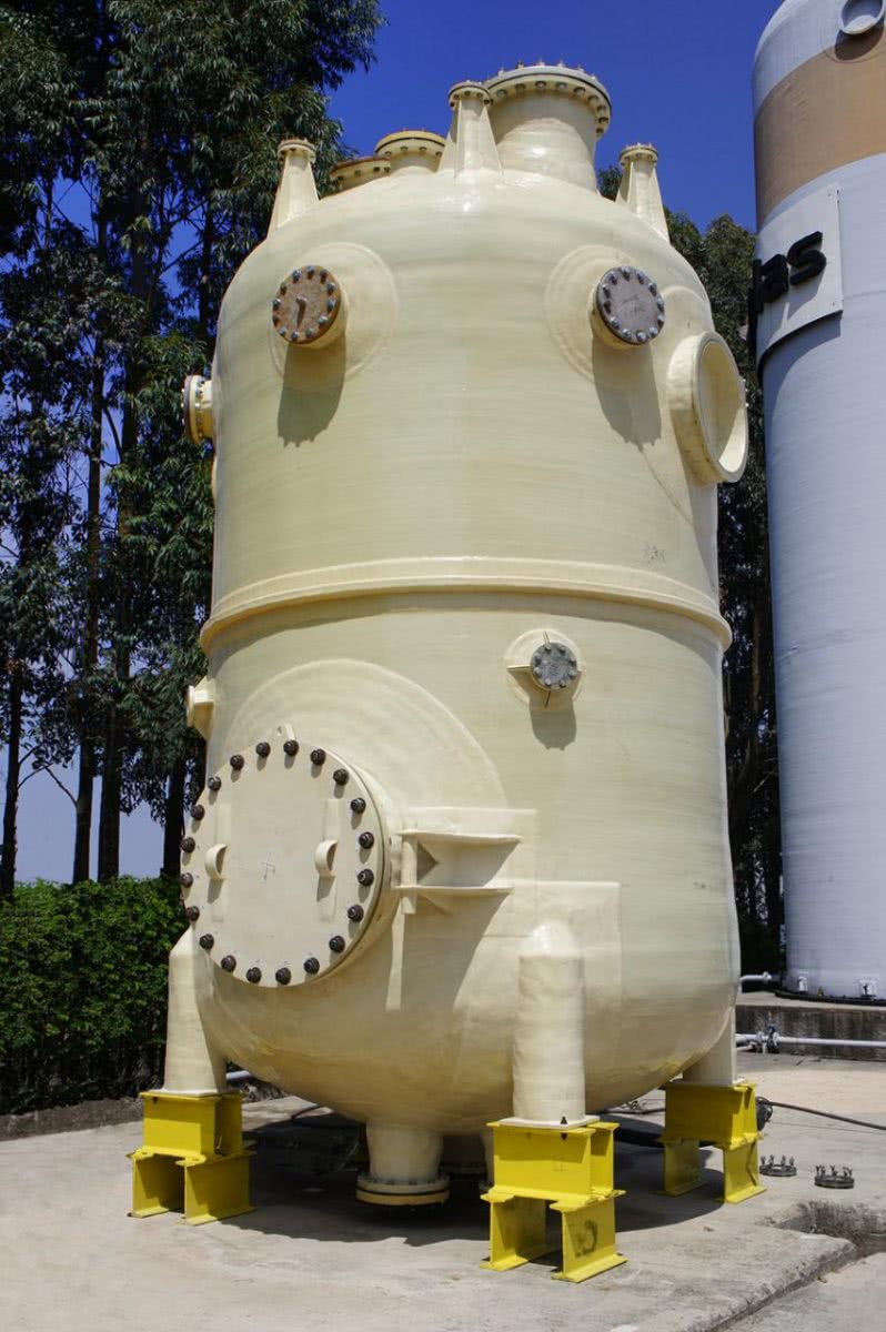 另一个复杂因素是底部和顶部是凸起的,这使得难以将圆柱体与设备的顶部和底部层压在一起。该柱具有3米直径,5.75米高和35立方米容量,具有高厚度,是承受高压所必需的特性,这也直接影响喷嘴的成分。