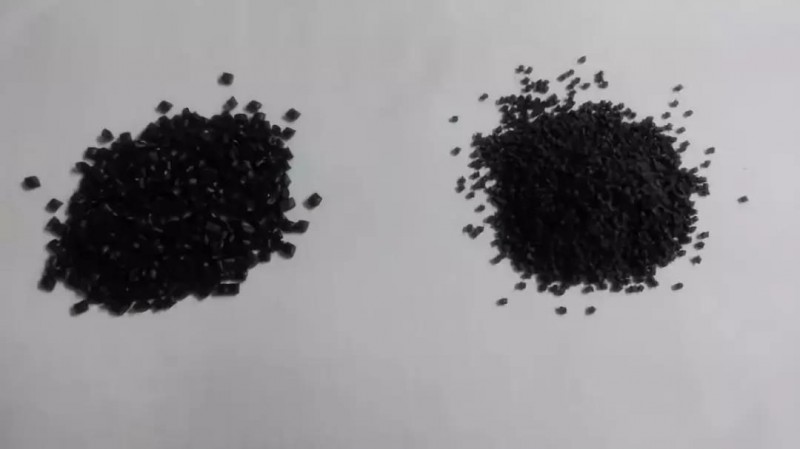 左图为来自废料的聚丙烯(PP)再生颗粒,右图为混炼复合后得到的新材料颗粒