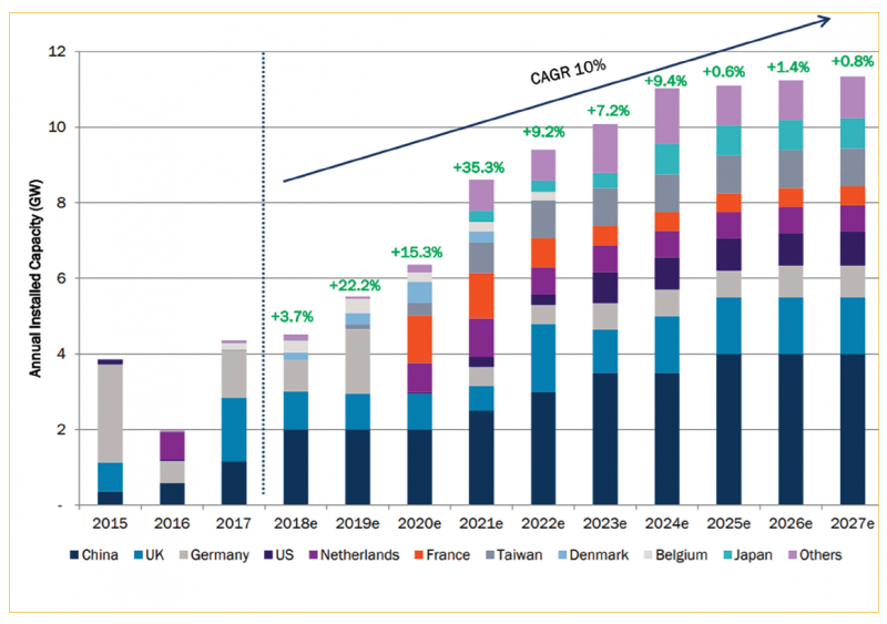 据总部位于伦敦的分析公司称,海上风电市场可能会从2018年的4,518兆瓦增长到2027年的11,340兆瓦。10年间的复合年增长率为10%,几乎是陆上风电的四倍。