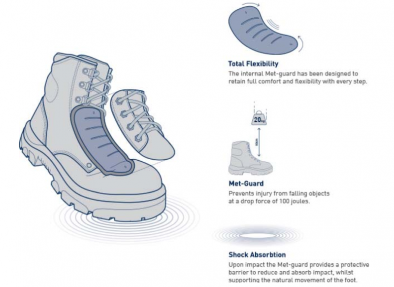 钢蓝色安全靴的性能正在增强,在跖骨守卫(钢蓝色的Met-Guard) PureGRAPH,这是专为保护跖骨区域的脚延伸到脚趾。这是一个受欢迎的选择,为采矿工人,工厂工人和钻井工人,他们往往需要额外的保护,提供的Met-Guard。