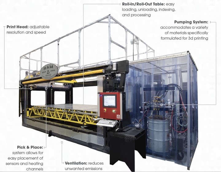 RAM机器使用红外摄像机和光学传感器来监控打印温度和放热RAM打印机配备红外摄像机和光学传感器,监测放热和符合优化参数,如ORNL的热化学流变模型所定义。