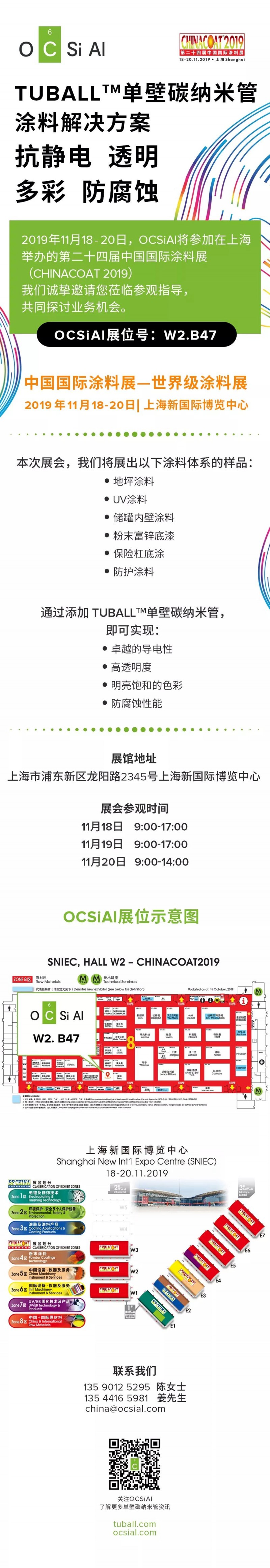 2019年11月18日-20日,OCSiAl将参加在上海举办的第二十四届国际涂料展(CHINACOAT 2019),欢迎您莅临OCSiAl展位,了解单壁碳纳米管在涂料应用的新解决方案。