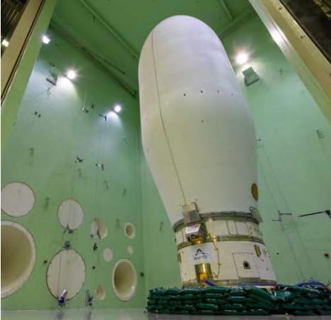 欧洲Vega-C发射器高10米的整流罩位于其上层结构模型的顶部,准备在ESA的大型欧洲声学设施(LEAF)中进行声学测试,该模拟能力可以模拟火箭起飞时产生的极高噪声。