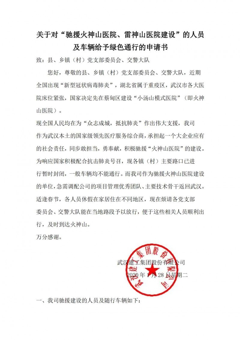 佳莱集团1月27日招募驰援建设武汉火神山医院手术室及ICU洁净病房自愿者共计20人,于湖南怀化出发,他们的主要工作是支援武汉火神山医院ICU病房的施工建设:此ICU洁净病房及手术室由武汉建工总包,武汉华康世纪公司承建。