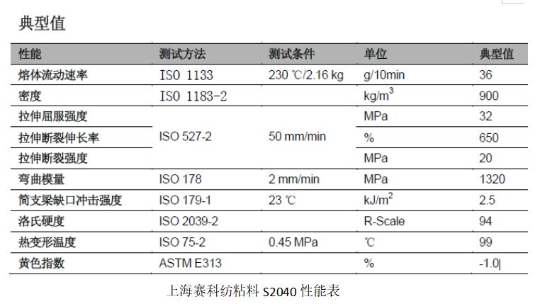 推荐材料:国产材料如山东道恩降解法聚丙烯:Z-1400,Z1500,进口如巴塞尔公司的茂金属聚丙烯HP461Y,MF650Y。推荐材料:熔体指数在25~60聚丙烯,比如埃克森美孚Exxon-Mobile的和上海赛科的2040都是很好的纺粘材料,如S2040性能指标如下: