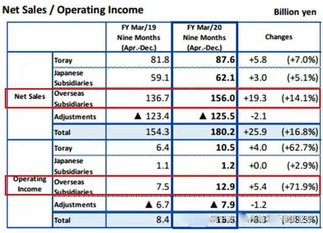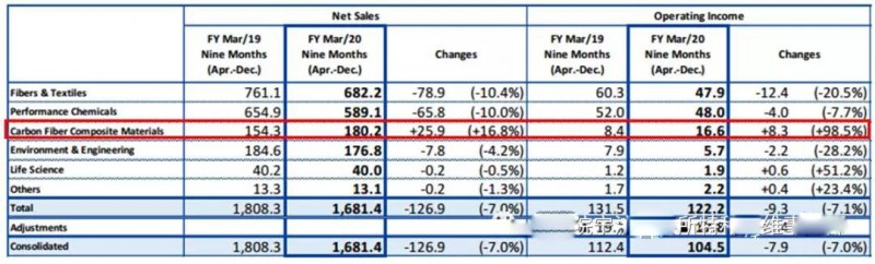 在东丽公司所有业务板块中,2020年4月-12月碳纤维复合材料的产品销售净额(Net Sales)、营业收入(Operating Income)与2019年相比将分别提高16.8%、98.5%(表1)。