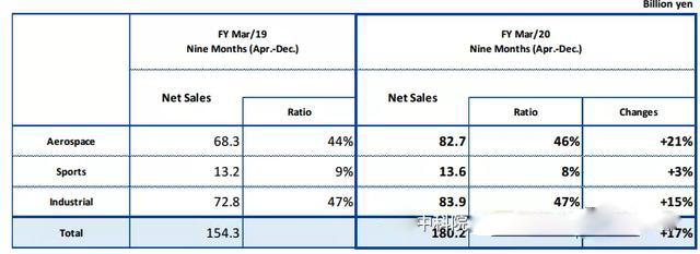 2月10日,日本东丽公司公布了2019年4月-12月公司的业务业绩报告,并对2020年业务发展进行了预测。2020年东丽公司碳纤维复合材料产值将呈持续增长态势,预计航空航天、运动器材、工业领域用碳纤维复合材料销售净额分别增长21%、3%、15%。