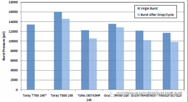 从上述图表中可以看出,采用东丽T800纤维时无论是气瓶初始爆破压力(Virgin Burst)亦或是循环爆破压力均为高值,因此采用东丽T800纤维具有生产重量更轻的压力,但经过计算与T700相比,纤维成本需要不超过19%才能具有优势。