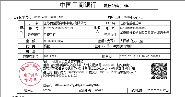 按照江苏省委提出的“要切实为前线战斗的人员提供有力保障,让他们全身心地投入到防疫战斗中去”的要求,并积极响应政协江苏省委员会的号召,2月17日,省政协委员、省复合材料学会副理事长、江苏澳盛复合材料科技有限公司董事长许文前同志向江苏省慈善总会捐款5万元,用于慰问赴鄂一线的江苏医护人员。