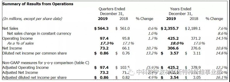与2018年相比,赫氏2019年度在太空与国防用碳纤维复合材料领域销售额为4.447亿美元,增长了20.2%(按固定汇率计算为21.6%)。其中在2019年1月,通过对ARC Technologies收购是增长的大推动力,在国防领域,赫氏销售主要来源于F-35联合攻击战斗机。