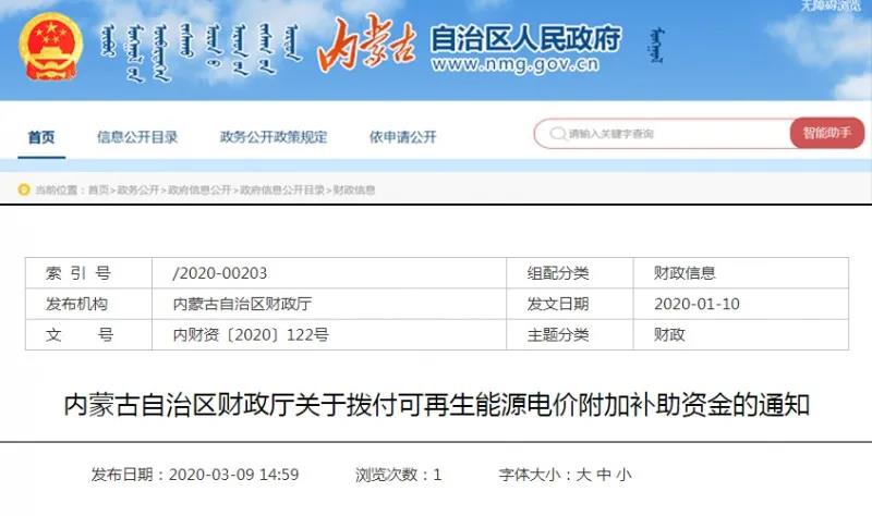 日前,内蒙古自治区财政厅下发了《关于拨付可再生能源电价附加补助资金的通知》的文件,风力发电补助资金28.9656亿元,今年可再生能源发放时间也要早于2019年,这意味着2020年的可再生能源补贴发放已经启动。