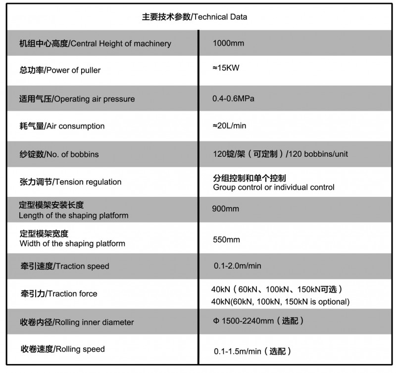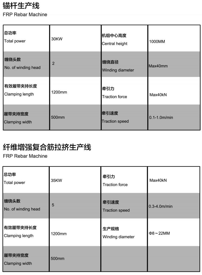 机组可以自动完成分纱、浸渍、预成型、缠绕、加热固化、牵引、定长切断和收集堆放。机组主要用于生产各种规格的玻璃钢复合筋、锚杆。