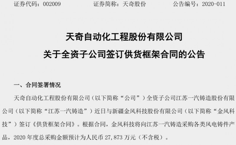 日前,天奇股份发布公告,其全资子公司江苏一汽铸造近日与金风科技签订《供货框架合同》。根据合同,金风科技将向江苏一汽铸造采购各类风电铸件产品,2020年度总采购金额预计为2.79亿元(不含税),占其近一个经审计会计年度(2018年度)营业总收入的7.96%。