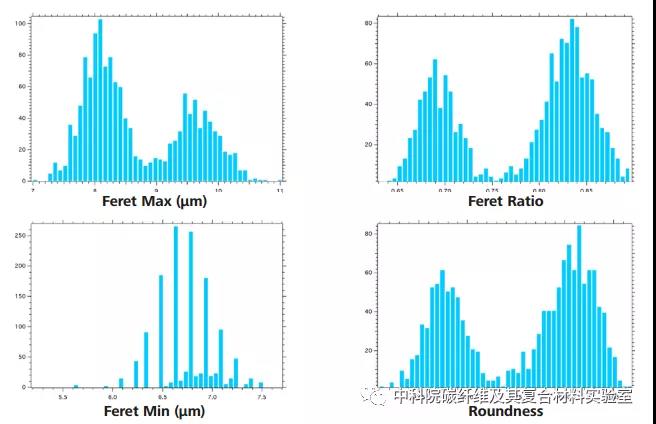 通过使用ZEISS ZEN 2 Core对光学显微照片进行数字二值化处理,实现了对光学数据的定量分析,测试结果显示复合材料中碳纤维体积分数为54%,以及纤维形状分布(Feret min, Feret max, Feret ratio, and roundness )和纤维横截面积分布,测试数据分别如图4所示。