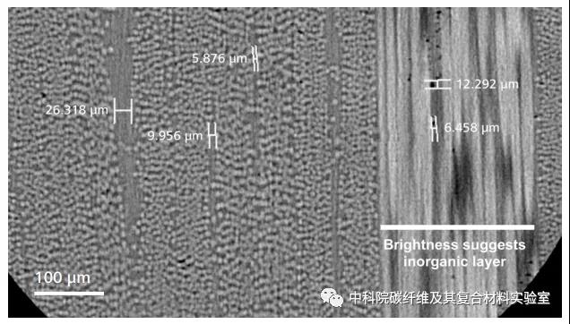 高分辨率的三维X射线图像证实,层合板中确实存在多层碳纤维,内部孔隙和分层约为一到几十微米。图7显示了一个虚拟切片示例,其中测量了几个空隙。值得注意的是,在试样的外部附近还观察到一个明亮的纤维状区域,这与局部无机成分一致。