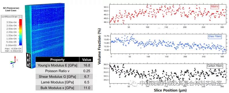 在分析这种多组分复合材料时,有一个基础认知,即主要失效模式是由极高的横向载荷产生的,导致裂纹形成、扩展和终断裂。因此,将三维相关数据集与相关材料特性(通过文献值获得)加载到GeoDict模拟引擎中,并施加虚拟横向(XZ)载荷。通过数字试验,对von Mises冯·米塞斯应变进行了3D分析,结果表明,在极限载荷下,纤维基体边界处存在高应变点。此外,该软件还生成了一个计算结果,显示了复合材料的力学性能,包括弹性模量和泊松比,其分析结果如图11所示,与典型碳纤维增强复合材料的预期性能一致。