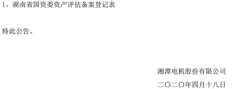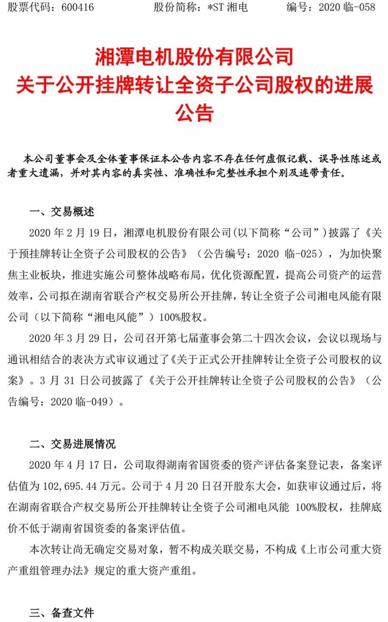 4月18日,湘潭电机发布关于公开挂牌转让全资子公司股权的进展公告,公告称:2020年4月17日,公司取得湖南省国资委的资产评估备案登记表,备案评估值为102,695.44万元。公司于4月20日召开股东大会,如获审议通过后,将在湖南省联合产权交易所公开挂牌转让全资子公司湘电风能100%股权,挂牌底价不低于湖南省国资委的备案评估值。