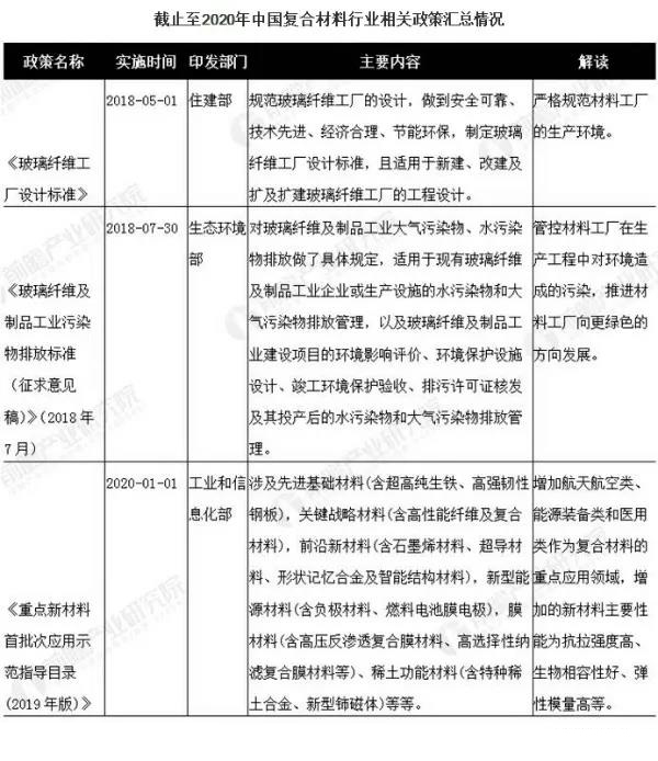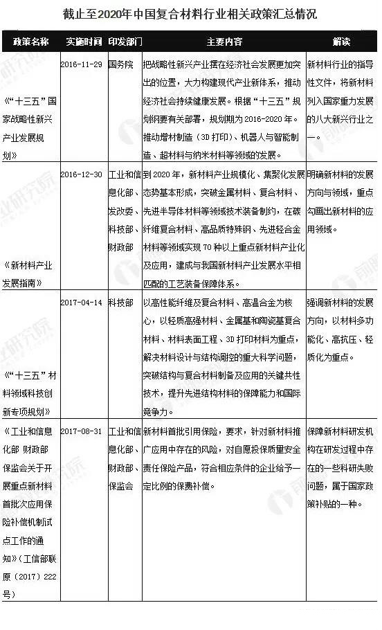 自2016年国务院出台“十三五”规划后,复合材料作为新材料的一种被列入要发展战略之中,之后发布的一系列政策都意在帮助新材料行业和复合材料行业更快更好的发展,其中包括明确新材料和复合材料的发展重点和发展领域。
