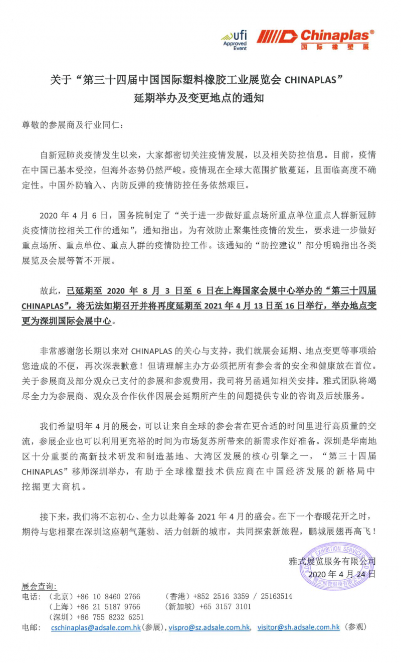 故此,已延期至2020年8月3日至6日在上海会展中心举办的“第三十四届CHINAPLAS”,将无法如期召开并将再度延期至2021年4月13日至16日举行,举办地点变更为深圳国际会展中心。