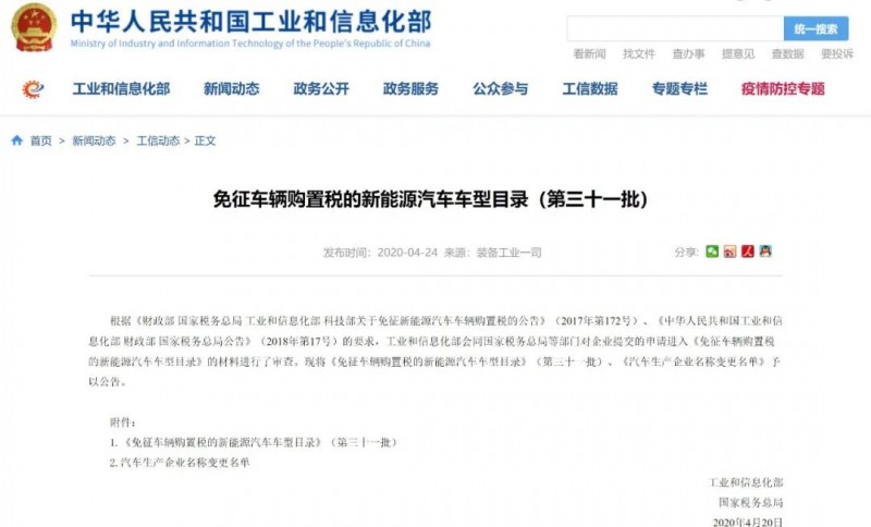 工信部发布第三十一批免征车辆购置税的新能源汽车车型目录