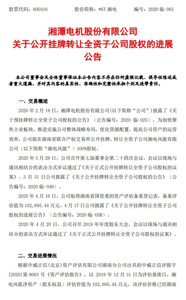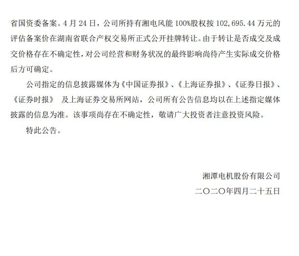 湘电风能100%股权近日正式在湖南联交所挂牌转让,底价是10.27亿元,截止时间为5月25日。2019年湘电风能资产总额为67.82亿元,年营收15.40亿元,净利润-9.38亿元。2020年季度,营收2.54亿元,净利润为-4842.13万元。