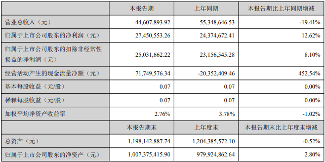 据了解,报告期内,公司生产经营状况稳定,实现营收44,607,893.92元,较上年同期下降19.41%,主要原因为报告期内,发出商品复验时间影响收入确认所致;实现归属于上市公司股东的净利润27,450,553.26元,较上年同期增加12.62%,主要原因是公司管理费用减少,其他收益增加(享受增值税免税)所致。