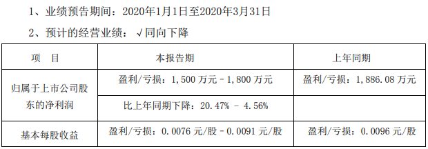 吉林化纤(000420)4月14日发布2020年一季度业绩预告:2020年1月1日至2020年3月31日预计盈利1500万元–1800万元,上年同期盈利1886.08万元,同比下降4.56%-20.47%。