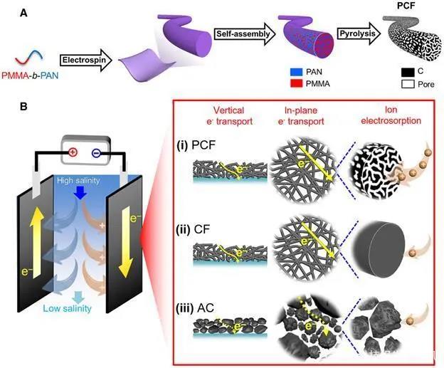 材料科学家们使用多孔碳作为CDI的主要电极材料,因为其具有导电率高、比表面积大、可定制的结构和优良的稳定性。例如活性炭、石墨烯气凝胶和从生物质中提取的大孔碳。然而,这类材料的脱盐能力和脱盐率仍有待提高。基于微孔和大孔材料的有限性能,Liu等人假设碳纤维由于相互关联的分层结构,将能够实现高脱盐率。在这项工作中,该团队展示了多孔碳纤维这一电容去离子的优越电极材料。这里的技术创新有赖于碳电极前体在分子水平上的设计。Liu等人通过电纺、氧化、稳定化和热解等方法,使用嵌段共聚物来制备多孔碳纤维。所得材料的有效海水淡化表面积大、结构丰富均匀、电子传输快、离子扩散快,提高了海水淡化能力。