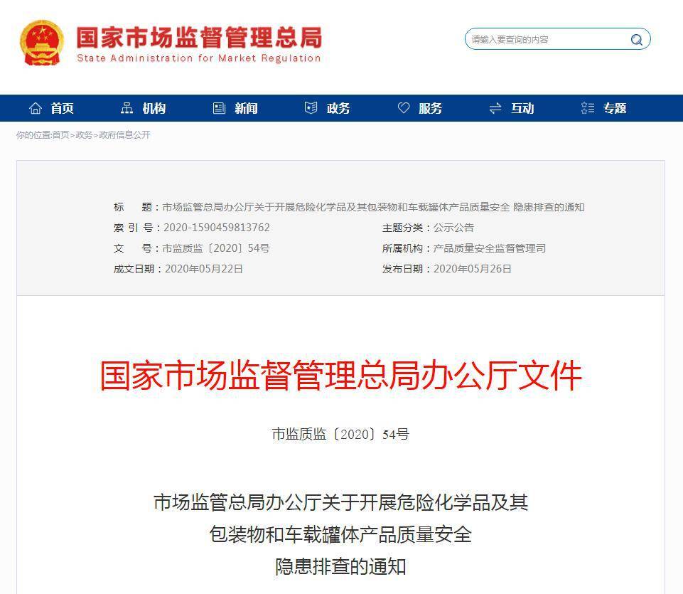 市场监管总局:对危化品等3类产品为重点开展安全排查