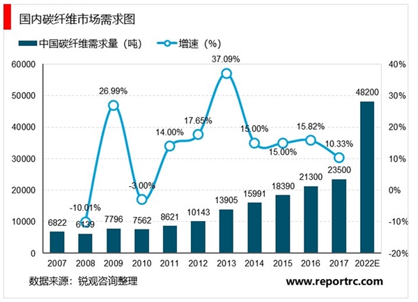 根据数据统计,自2010年起,国内碳纤维需求呈增长趋势,2017年需求量约为23,500吨,随着我国国民经济的发展以及国防工业战略地位的进一步提升,未来几年我国碳纤维需求量将进入一个快速增长的时期,预计到2022年国内碳纤维的需求将达到48,200吨。