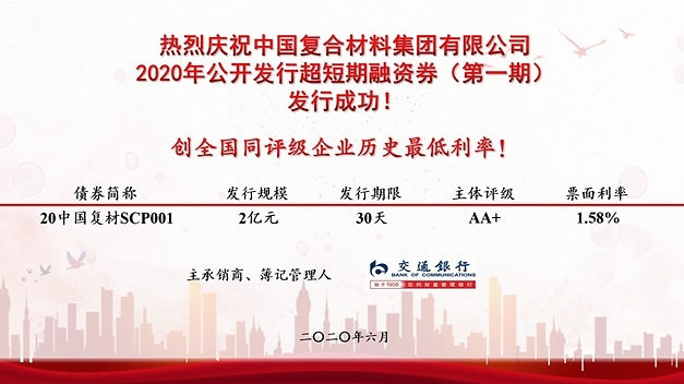 6月16日,复合材料集团有限公司成功发行2亿元超短期融资券,期限30天,票面利率1.58%,在债券市场创同评级企业历史低利率!
