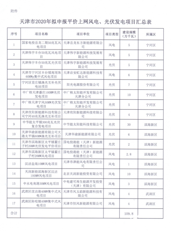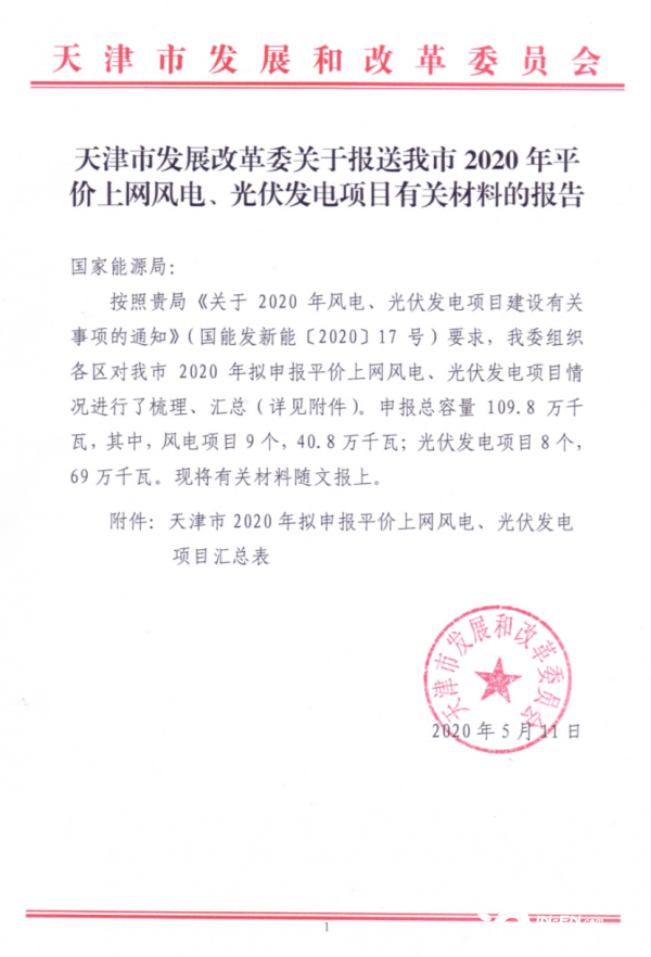 近日,天津市发改委发布了关于2020年平价上网风电、光伏发电项目有关材料报告。根据通知,天津市平价项目申报总容量1.098GW,其中光伏项目8个,共690MW;风电项目9个,共408MW。