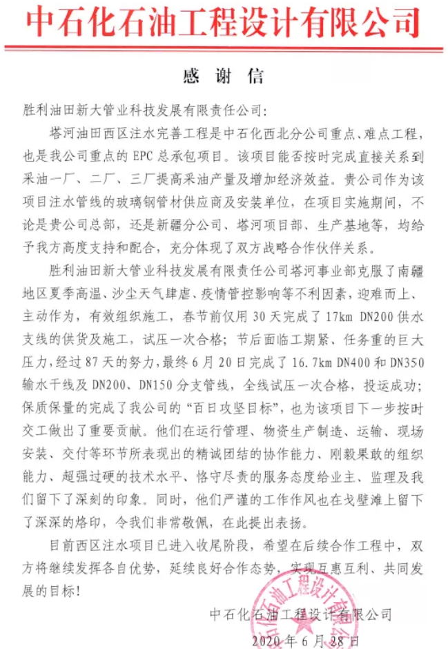 胜利油田新大管业科技发展有限责任公司: 塔河油田西区注水完善工程是中石化西北分公司重点、难点工程,也是我公司重点的EPC总承包项目。该项目能否按时完成直接关系到采油一厂、二厂、三厂捉高采油产量及增加经济效益。贵公司作为该项目注水管线的玻璃钢管材供应商及安装单位,在项目实施期间,不论是贵公司总部,还是新疆分公司、塔河项目部、生产基地等,均给予我方高度支持和配合,充分体现了双方战略合作伙伴关系。 胜利油田新大管业科技发展有限责任公司塔河事业部克服了南疆地区夏季高温、沙尘天气肆虐、疫情管控影响等不利因素,迎难而上、主动作为,有效组织施工,春节前仅用30天完成了17km DN200供水支线的供货及施工,试压一次合格;节后面临工期紧、任务重的巨大压力,经过87天的努力,终6月20日完成了16.7km DN400和DN350输水干线及DN200、DN150分支管线,全线试压一次合格,投运成功;保质保量的完成了我公司的“百日攻坚目标”,也为该项目下一步按时交工做出了重要贡献。他们在运行管理、物资生产制造、运输、现场安装、交付等环节所表现出的精诚团结的协作能力、刚毅果敢的组织能力、超强过硬的技术水平、恪守尽责的服务态度给业主、监理及我们留下了深刻的印象。同时,他们严谨的工作作风也在戈壁滩上留下了深深的烙印,令我们非常敬佩,在此提出表扬。 目前西区注水项目已进入收尾阶段,希望在后续合作工程中,双方将继续发挥各自优势,延续良好合作态势,实现互惠互利、共同发展的目标!