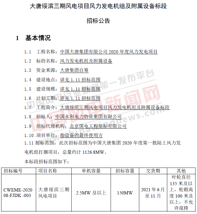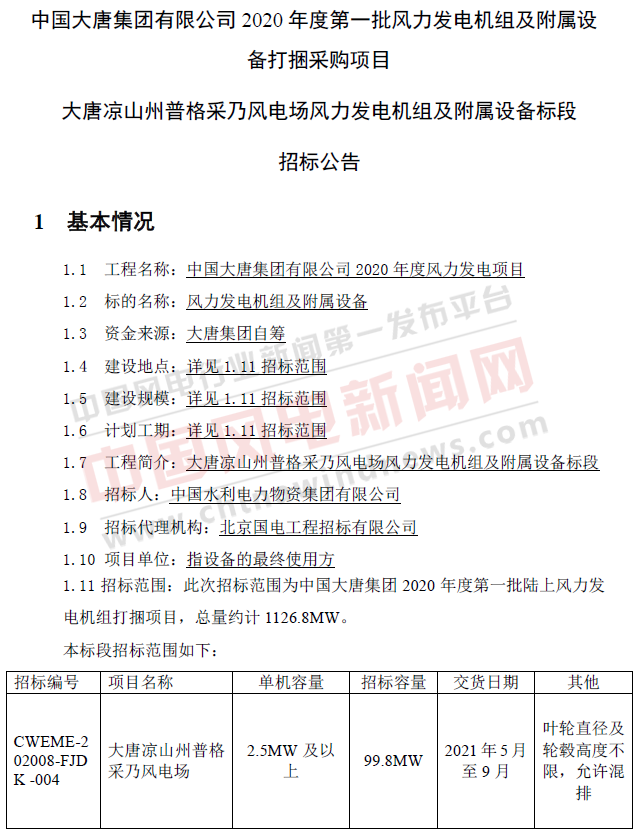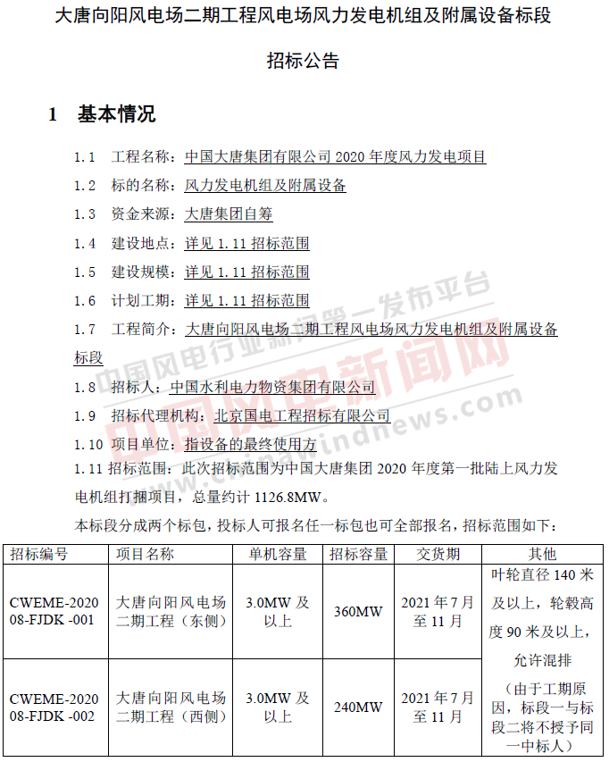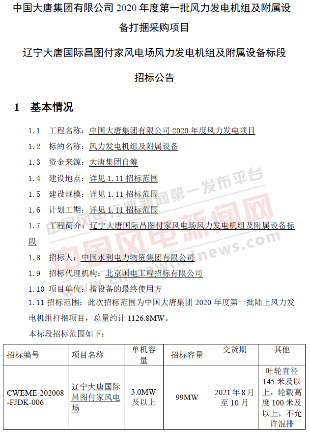 【风电】1126.8MW!大唐集团2020年度批陆上风电机组打捆招标