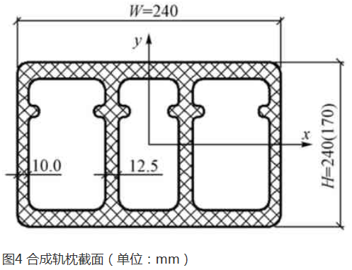 合成轨枕2 与木枕截面抗弯刚度一致,可作为替代木的佳尺寸。考虑与扣件、纵梁及钩头螺栓的安装问题,对合成轨枕截面形式进行优化(图6),增设底面凸肋,用于轨枕底托安装使用。