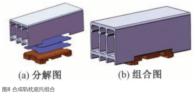 由于钢桥明桥面上设有预拱度、纵横梁平交螺栓、防爬角钢等,因此轨枕在纵梁不同位置的安装高度也有所差别。对于木枕来说,一般在其底部刻槽,通过调整刻槽深度和刻槽位置满足不同安装位置要求。合成轨枕在满足使用强度和挠度要求的前提下,截面尺寸相对较小,因此在既有明桥面上有足够的空间调整安装高度。本轨枕采用一种可调节的底托标准件组合结构(图8),底托标准件由不同厚度和型号的调高垫板、轨枕底托组成,可适应不同纵梁位置安装,减少现场作业量。轨枕底托与轨枕底部凸肋形成纵横向限位以保证底托的稳定性。